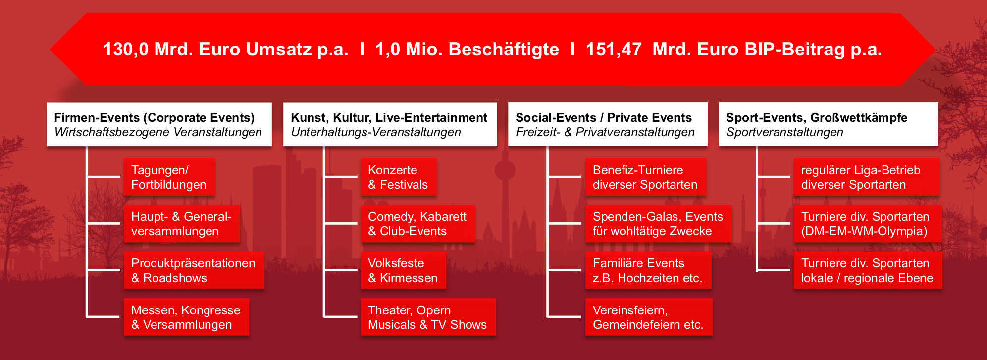 Die Veranstaltungswirtschaft finanziert als Veranstalter im Auftrag der deutschen Wirtschaft, der Kultur- und Sportbranche sowie des Privatsektors unterschiedlichste Veranstaltungsformate und ein differenziertes System von hochspezialisierten Dienstleistungsunternehmen aus technischen, handwerklichen, künstlerischen und personalwirtschaftlichen Berufszweigen. Insgesamt vereint die Veranstaltungswirtschaft eine große Anzahl unterschiedlicher Berufssparten unter Ihrem Dach: